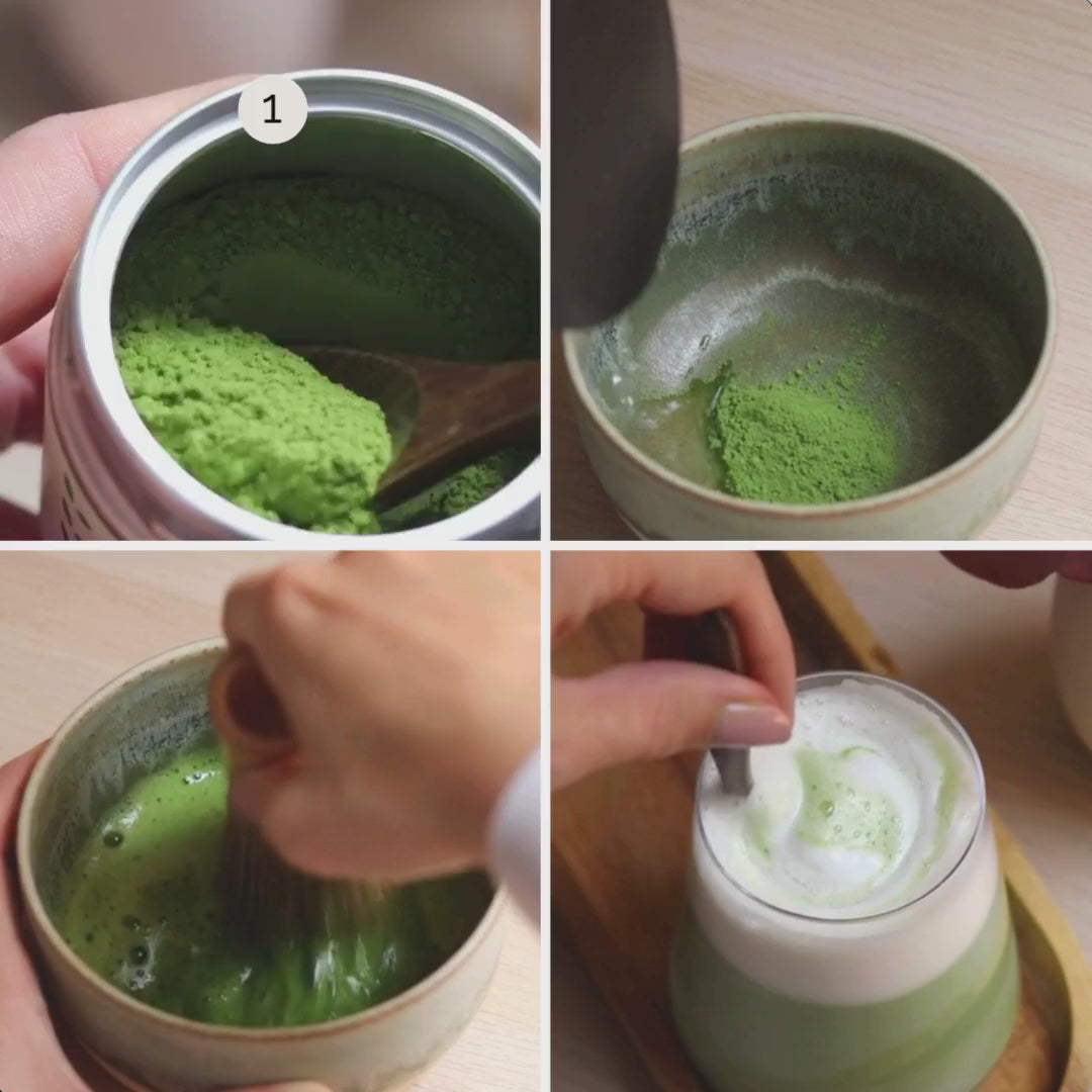 • Étape 3 et 4 : Fouettez vigoureusement jusqu'à obtenir une mousse onctueuse. Dégustez-le tel quel ou ajoutez-y le lait de votre choix pour un savoureux matcha latte.